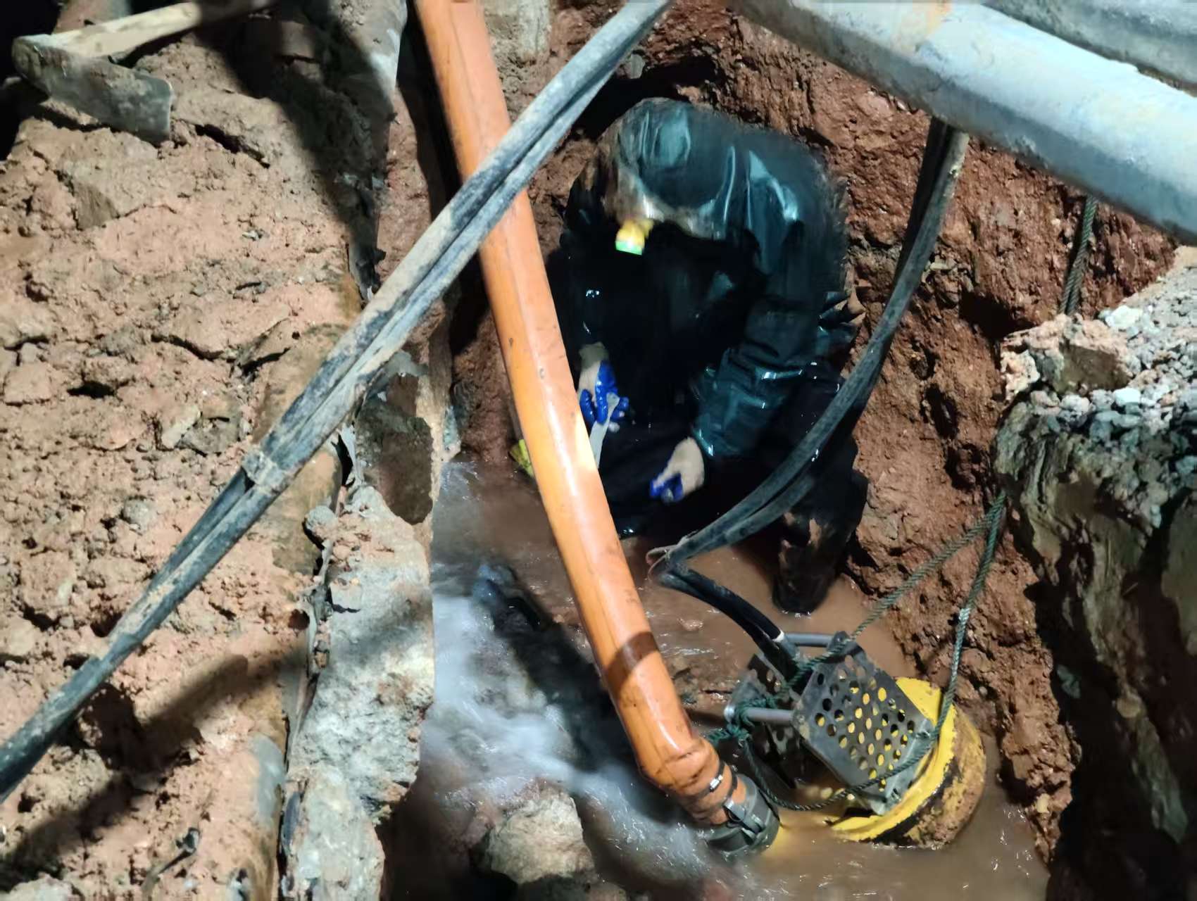 此次搶修現(xiàn)場環(huán)境極為復(fù)雜,漏水點(diǎn)藏于管道正下方,且管道上方密布電纜、光纜等線管,狹小的作業(yè)空間、復(fù)雜的施工環(huán)境給搶修工作帶來極大挑戰(zhàn)。彼時(shí)夜間氣溫低、坑道內(nèi)泥濘積水,進(jìn)一步增加了搶修難度。但搶修人員毫不退縮,毅然跳入冰冷的泥濘坑道,克服夜間低溫、泥水刺骨等多重困難,輪番上陣、連續(xù)作戰(zhàn)。他們趴在泥水里摸索漏點(diǎn)、徒手清理淤積的泥塊,又躬身對接管道、緊固密封部件。手套上的熱氣與冰冷的泥水形成鮮明對比,他們身上凍得直打哆嗦,卻始終堅(jiān)守崗位,心中只有“盡快修復(fù)漏點(diǎn)、恢復(fù)供水”的目標(biāo)。1月9日凌晨3點(diǎn),經(jīng)過數(shù)小時(shí)的緊張搶修,恢復(fù)了正常供水。
